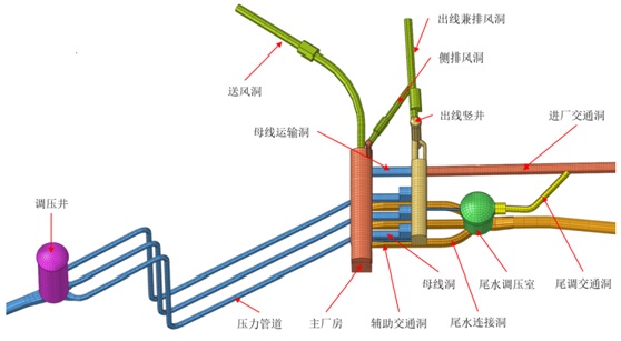 地下厂房位于河道右岸花岗岩山体内,采用地下厂房经典布置形式,轴线N65°45'10'W,主副厂房总长142.04m,宽25.00/23.00m(上游/下游),主变洞长98.17m,宽18.10m,尾水隧洞全长1739.14m,纵坡i=0.62%,采用圆形断面,内径11.0m~13.8m。