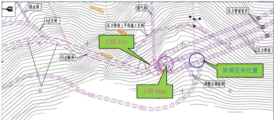 上游调压室高90.5m,井筒内径30m,工程开工后,根据调压井检修洞开挖揭示地质条件、地质预报和可研阶段专家意见,从2022年6月~2023年6月,设计对上游调压井型式、位置开展了专题优化研究,过程中数次组织业内专家进行了咨询,最终选定了上移87m圆筒式调压室方案,该方案地质条件较优,穹顶开挖仅用时1.5个月,竖井开挖用时4个月。上游调压井开挖过程中设计结合实际地质条件进行了开挖支护优化研究,确定了调压井中下部以长锚筋桩替代锚索的优化方案的可行性,井筒锚索优化后投资预计减少约234万元,规避了张拉等强等工序,施工难度显著降低,工期缩短约3-4月。